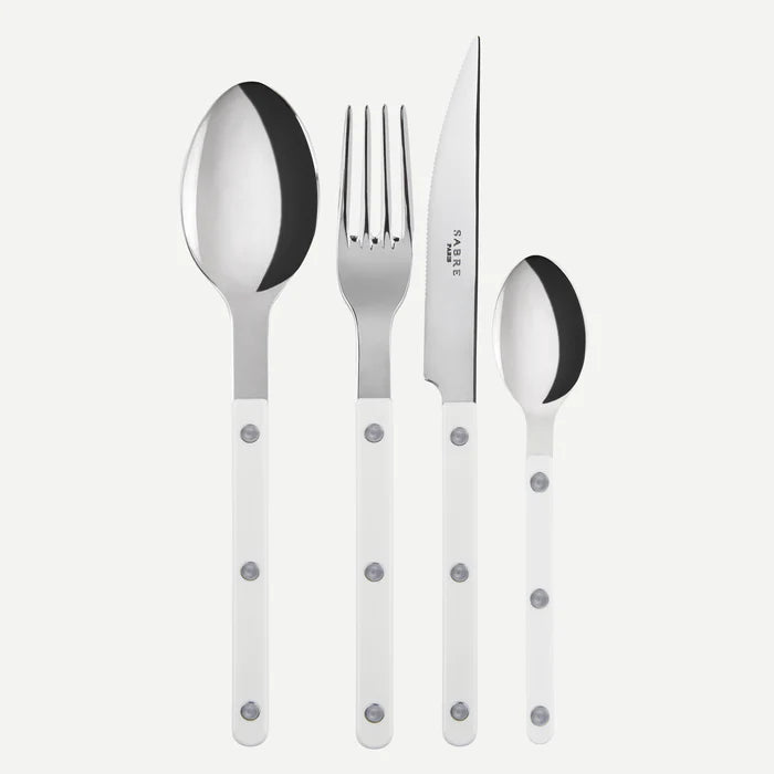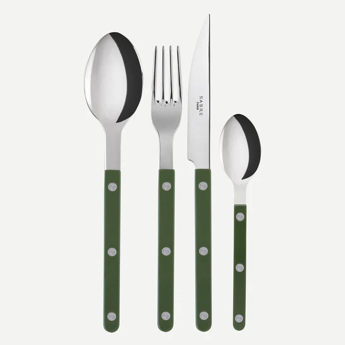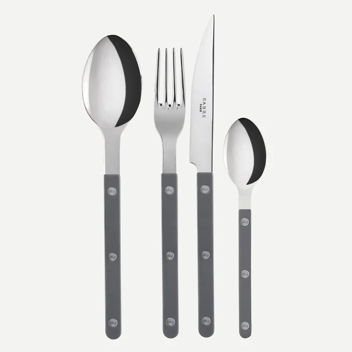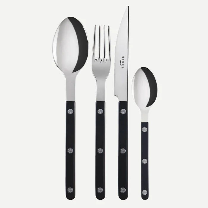 Med Bistrot-kollektionen inspirerades vi av några av våra favoritställen: restauranger, terrasser och caféer. När vi designade dessa bestick ville vi troget fånga atmosfären samtidigt som vi tillför en modern touch: stylingen är enkel, nitarna är synliga, medan färgerna och materialen sticker ut snyggt. Från rött till blått, inte att förglömma de suveräna materialen med horn- eller sköldpaddseffekter. Tillgänglig med glans eller vintage finish, vi är säkra på att du kommer att njuta av denna kollektion, som är designad för att vara både traditionell och modern på samma gång. Detta 24-delade Sabre hushållsbesticksset består av 6 soppskedar, 6 middagsgafflar, 6 middagsknivar och 6 teskedar. Det är det perfekta setet för dina måltider.