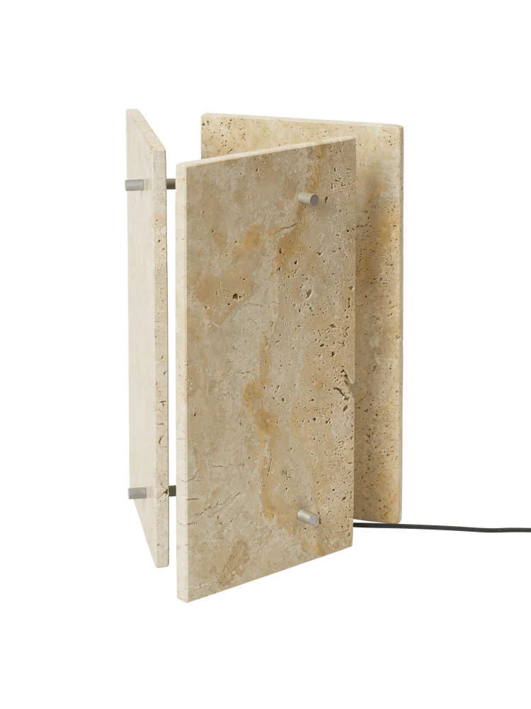 Bordslampan Oeste från Ferm Living består av tre paneler i travertin. Lampan ger ett dynamiskt, varmt ljus och är dimbar.
