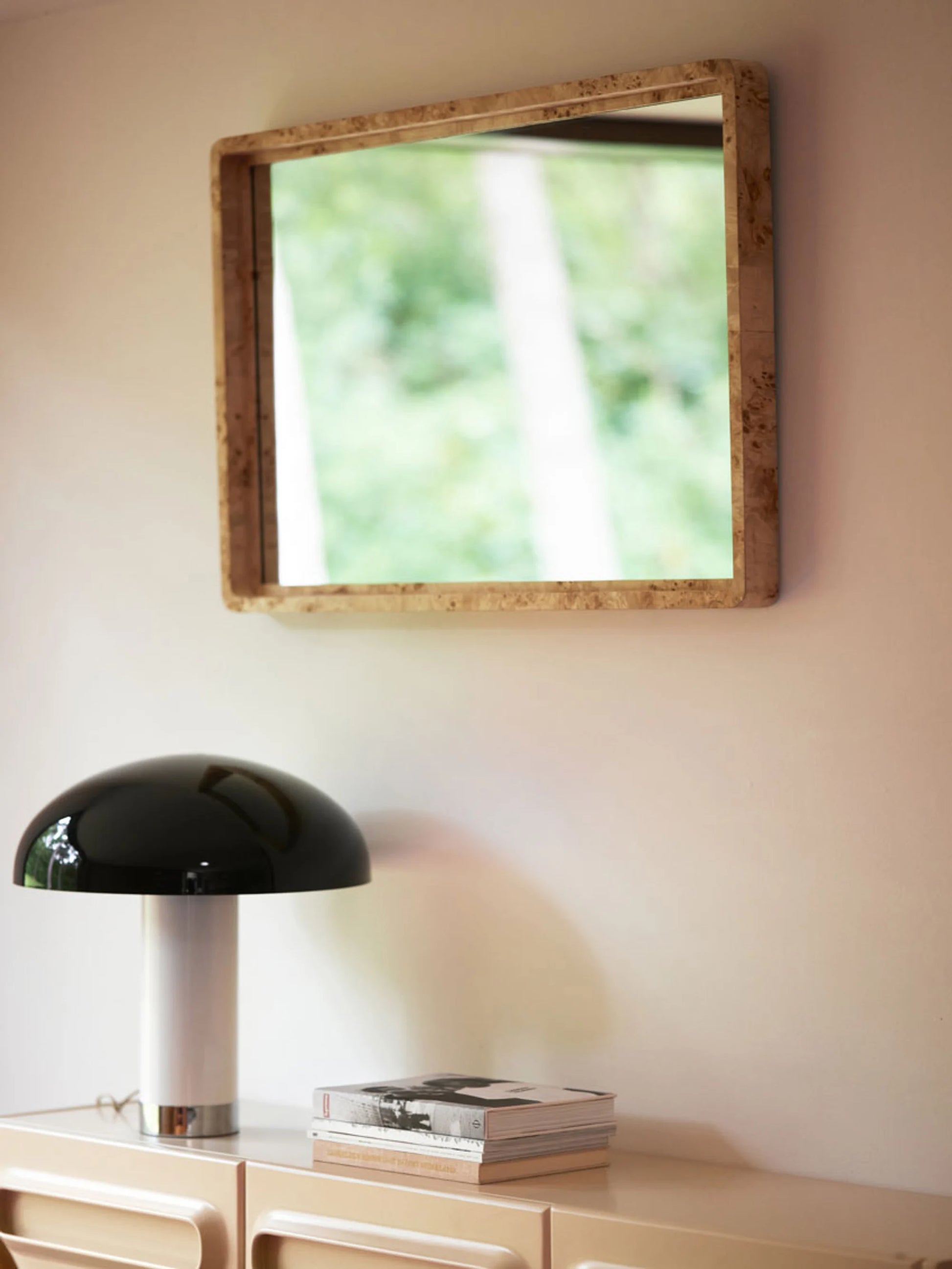Ta med ett speciellt föremål in i ditt hem med denna väggspegel. Spegeln är gjord av en speciell faner av burl-trä, som är mycket uppskattad för sin skönhet och sällsynthet, vilket gör den till en unik pjäs. Du kan placera spegeln ovanpå ett skåp som lutar mot väggen eller fästa den på väggen med hjälp av stålöglorna.