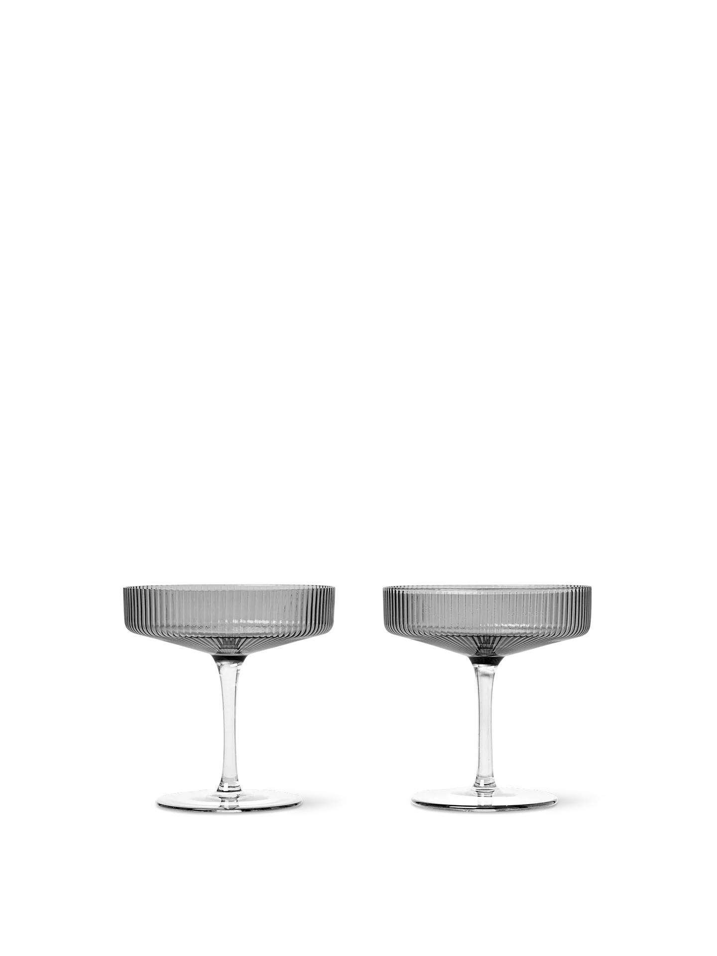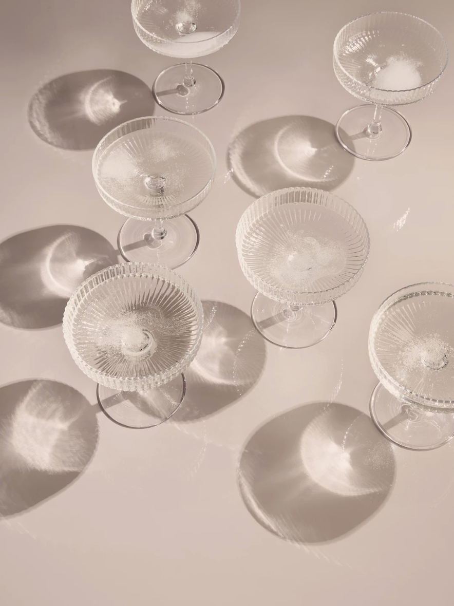 Ripple Champagne Saucer, champagneglas från Ferm Living i klassisk form men med en modern ribbad design. Champagneglasen är en del av Ferm Livings serie Ripple som består av flera glas och en karaff. Glasen i serien handblåses in i en form för att få till det dynamiska och expressiva utseendet.