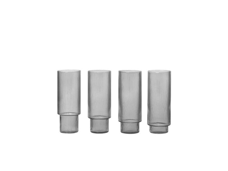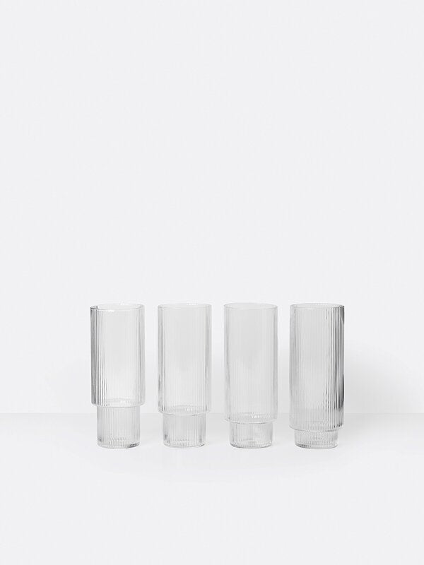 Ett tidlöst set drinkglas från Ferm Living. Dessa unika glas är resultatet av hantverksmässig skicklighet och noggrann design. Med sin karakteristiska form och distinkta vågiga mönster ger "Ripple" en särskild touch till din dryckesupplevelse. Oavsett om det är för en avkopplande stund eller för att imponera på gästerna, låter dessa glas dig njuta av varje klunk med stil.