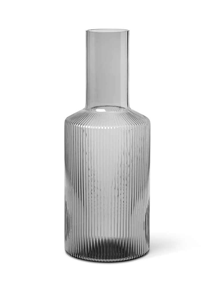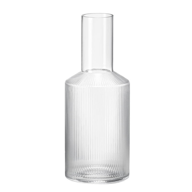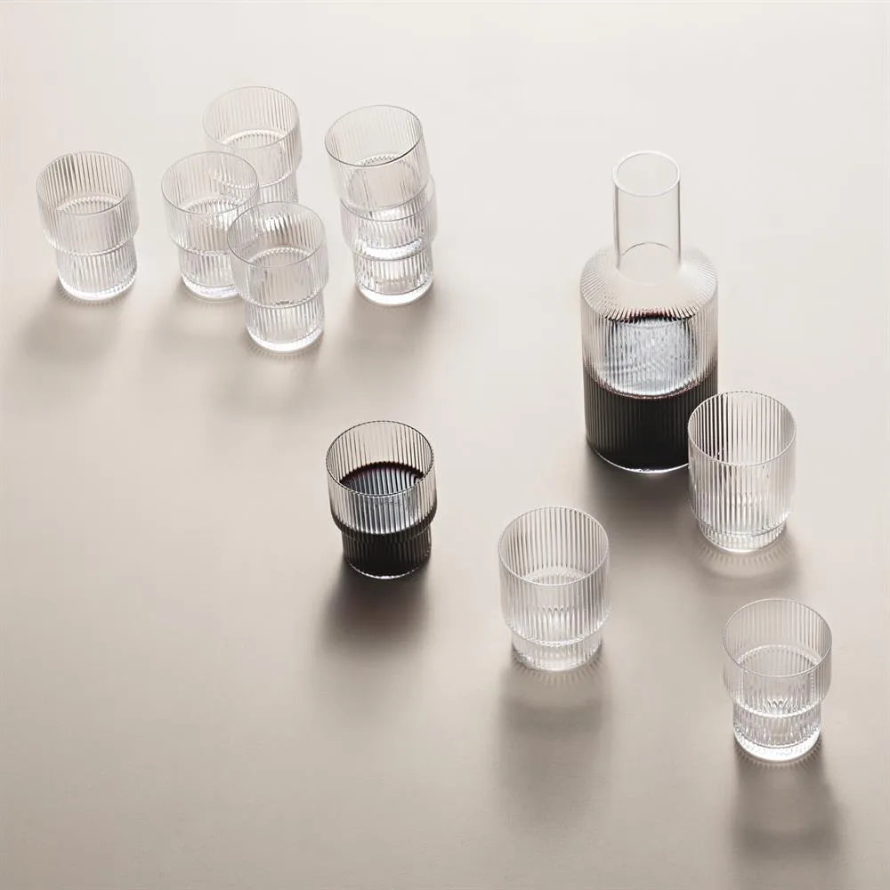 Denna praktiska och vackra karaff är munblåst i formen och har en vågig design för en modern look. Fyll på med vatten, juice eller din favoritdryck och häll upp i den matchande uppsättningen glas för ett elegant sätt att servera.