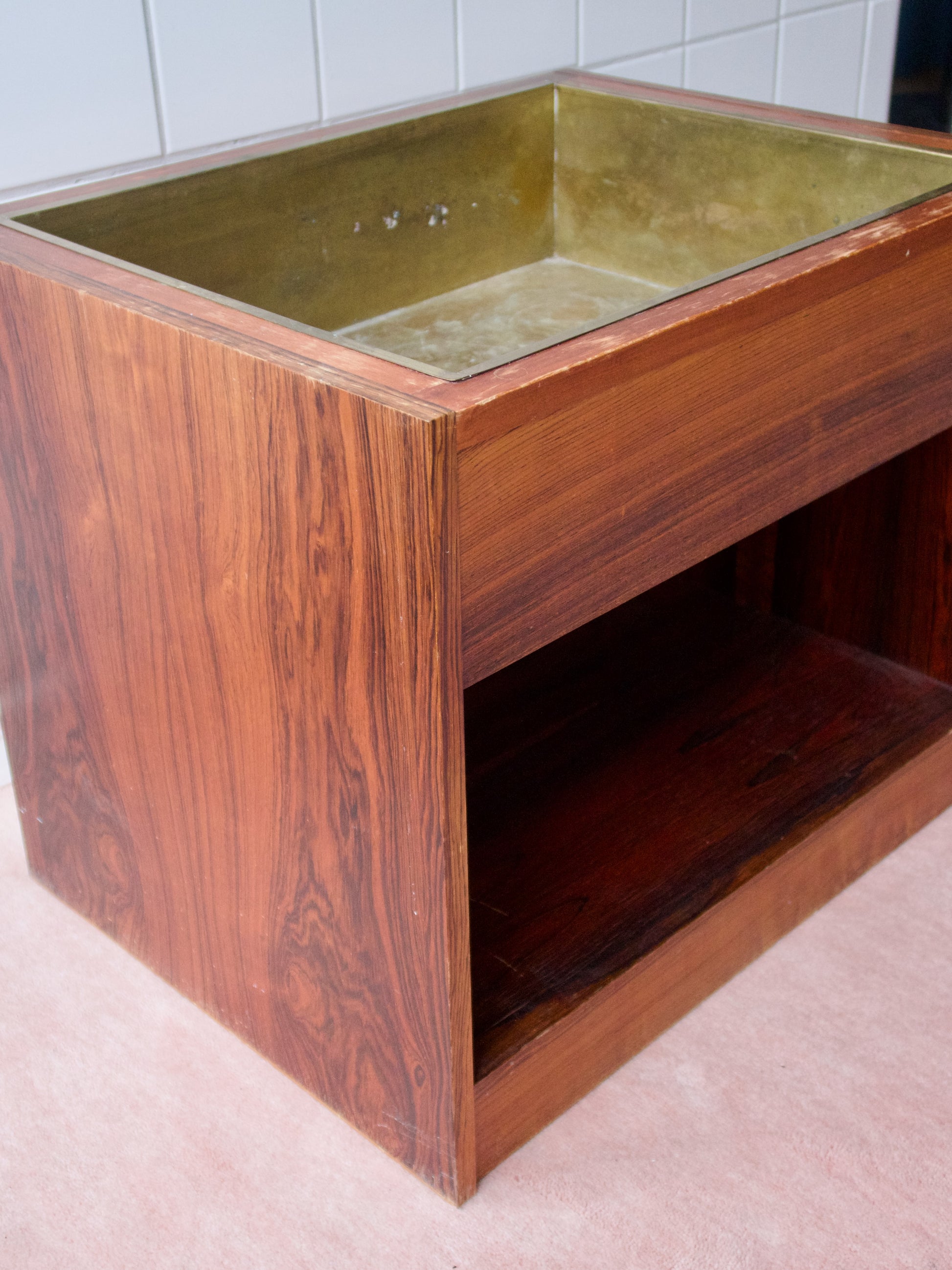 Sidobord i trä med blomlåda i patinerad mässing
