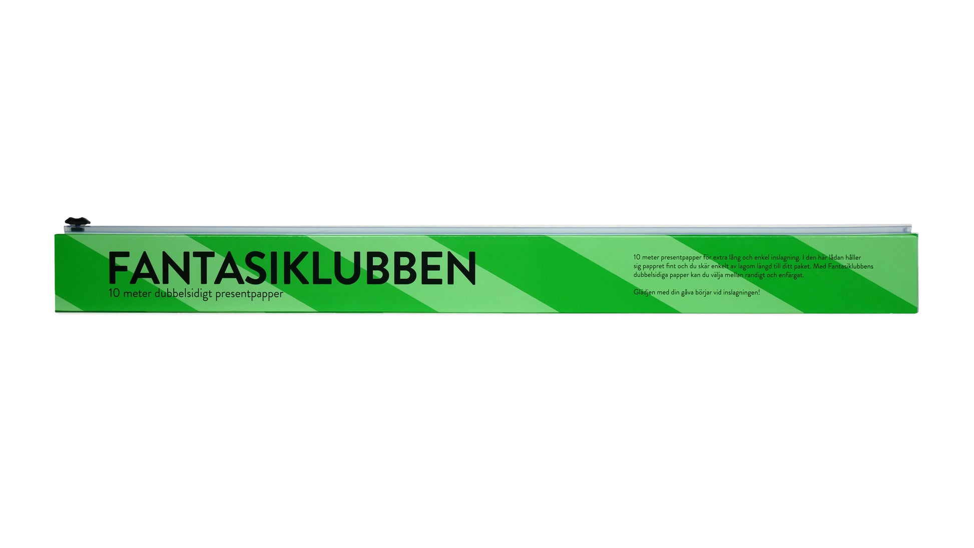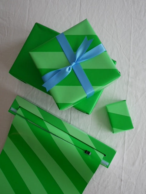 10 meter dubbelsidigt presentpapper i smart förpackning. Skär enkelt av önskad längd och välj mellan två de två olika sidorna, randigt eller enfärgat.