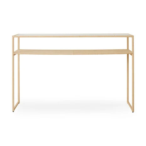 Visa personliga och dekorativa föremål på en elegant raffiakonsol. Tack vare sin rena och slanka form och kontrasten mellan naturmaterialen och glasskivan kan du skapa en lätt och luftig look. Perfekt för smala korridorer, tomma väggar eller bakom din soffa.