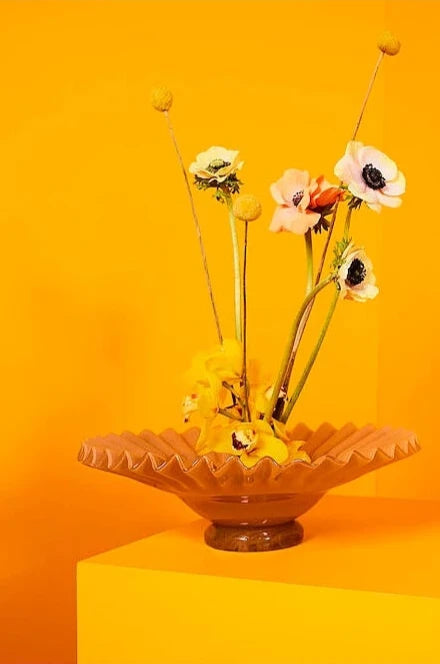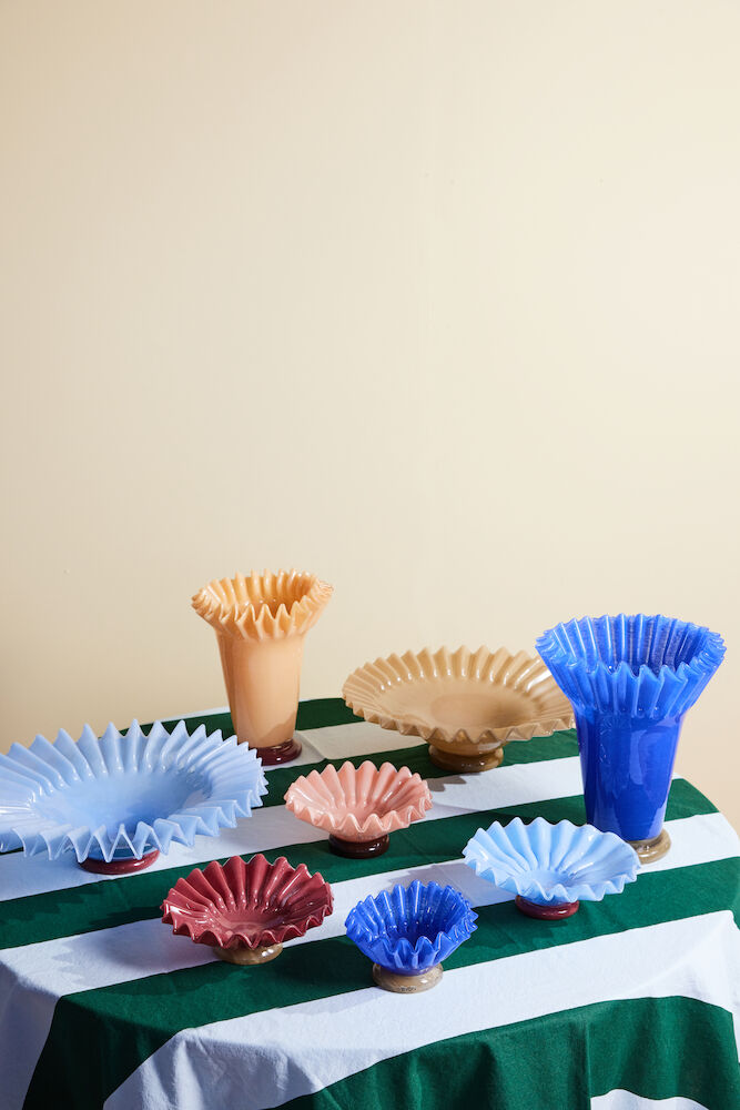 Med inspiration från modevärldens plisserade kjolar påminner formen om en blomma som precis ska slå ut sina blad. De glaserade färgerna och den runda, låga foten i kontrast gör Lori till en skapelse man inte glömmer i första taget. Loris produkter är handgjorda vilket gör att varje enskild del är unik och skiljer sig åt.