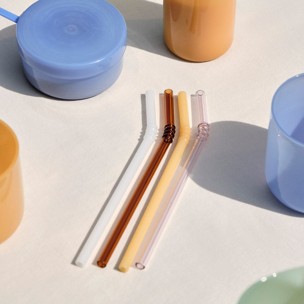 Sip Straws är en serie återanvändbara sugrör tillverkade i borosilikatglas för användning med varma eller kalla drycker. Funktionella och dekorativa, sugrören sätter färg på bordet och lyfter måltider eller dryckesupplevelser. Sugrören erbjuds i en mängd olika färger och utföranden och kommer i 4-pack med en praktisk rengöringsborste.
