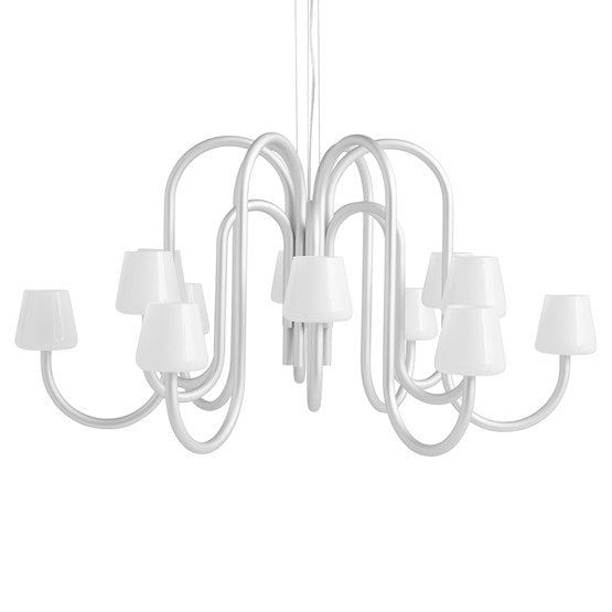 Designad av STUDIO 0405, är Apollo Chandelier en modern version av en klassisk lamparketyp som delar grundläggande strukturella egenskaper hos den traditionella ljuskronan uppdaterad i en skulpturell och funktionell design. Består av flera munblåsta opalglasskärmar ovanpå böjda rörformade armar, vilket skapar ett kontrasterande uttryck mellan de handgjorda, organiskt formade nyanserna och de industriella anodiserade aluminiumslangarna. Apollo ljuskrona är ett idealiskt mittpunkt i rummet som lämpar sig för användning på en mängd olika privata och offentliga platser. Finns i två olika storlekar, med sex eller 12 armar.
