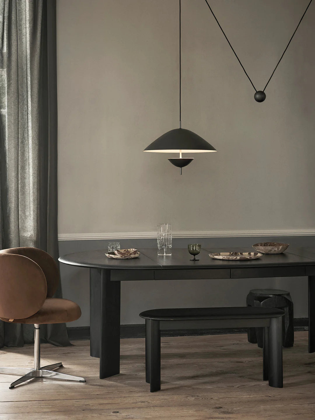 Lod pendel från Ferm Living är tillverkad av målat järn och fångar upp en lekfull men ändå elegant design. Denna hängande lampa har en grafisk silhuett och dess höjd kan enkelt justeras med hjälp av en motvikt. Den ger ett mjukt och ljust sken som bidrar till en lugnande atmosfär. Lampan kompletteras av en matchande takfäste och baldakin samt en textilkabel som förstärker dess visuella attraktionskraft.