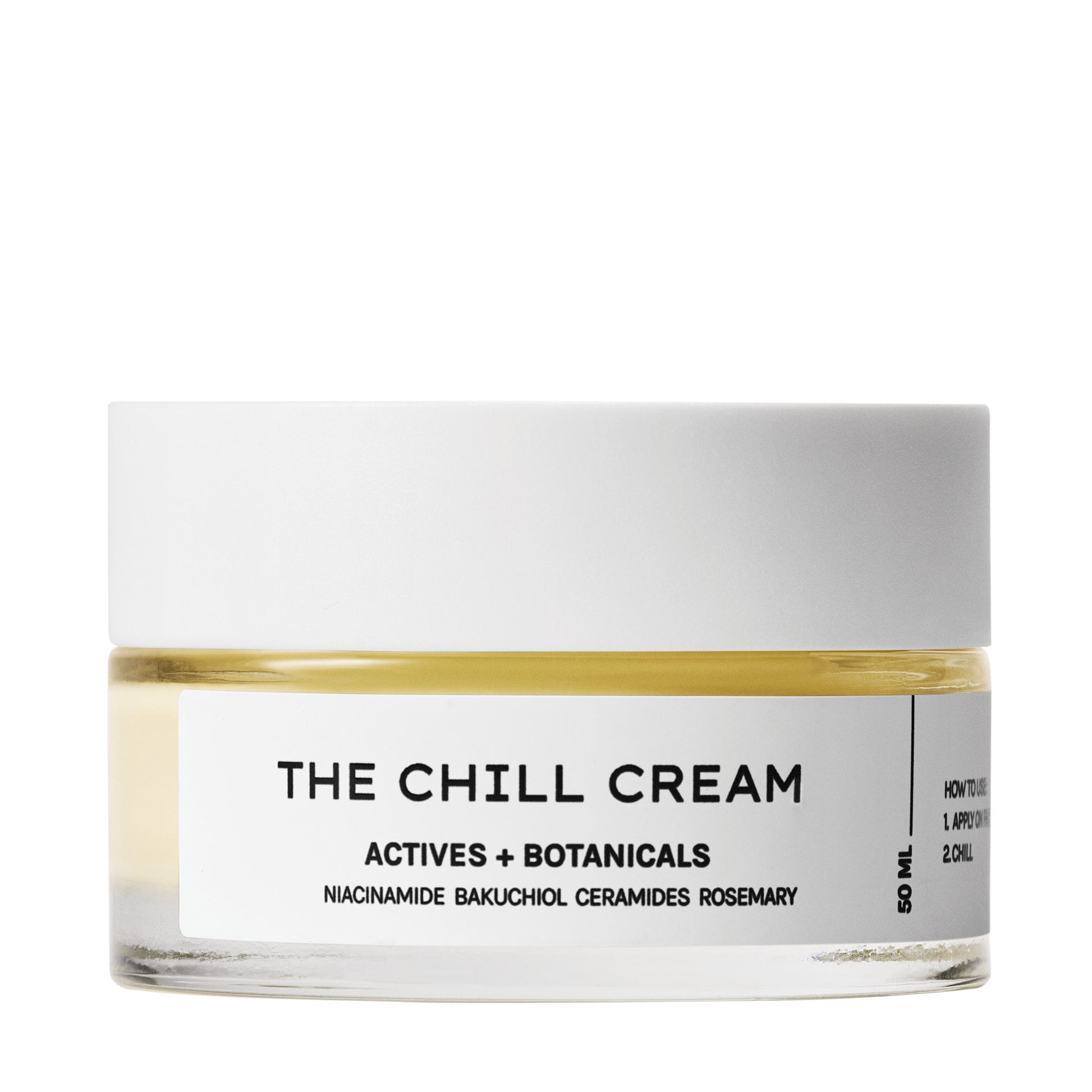 The Chill Cream är en lugnande och balanserande 24-timmars kräm som stärker hudbarriären och lugnar din hy. Den innehåller niacinamid, bakuchiol, ceramider och rosmarinextrakt och minimerar rodnad, förfinar porerna, ökar elasticiteten och ger djupt penetrerande fukt.