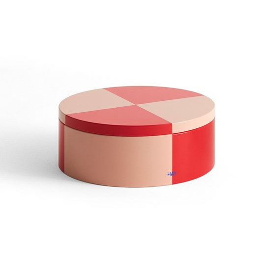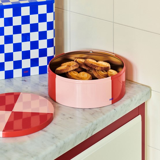 HAYs plåtbehållare är en samling funktionella och dekorativa förvaringslådor med färgglada rutmönster och en glansig finish. Locket och behållaren är jämnt inriktade, vilket skapar ett elegant, sömlöst utseende, samtidigt som de säkerställer en lufttät passform som är lämplig för förvaring av torr mat. Plåtbehållaren finns i ett brett sortiment av storlekar, former och mönster och kan placeras dekorativt på hyllor eller bord runt hemmet för att förvara och organisera olika föremål.